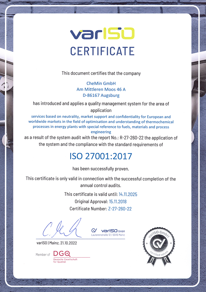 CheMin GmbH holds the following certificates for services in the field of optimising and understanding thermochemical processes in power engineering plants: