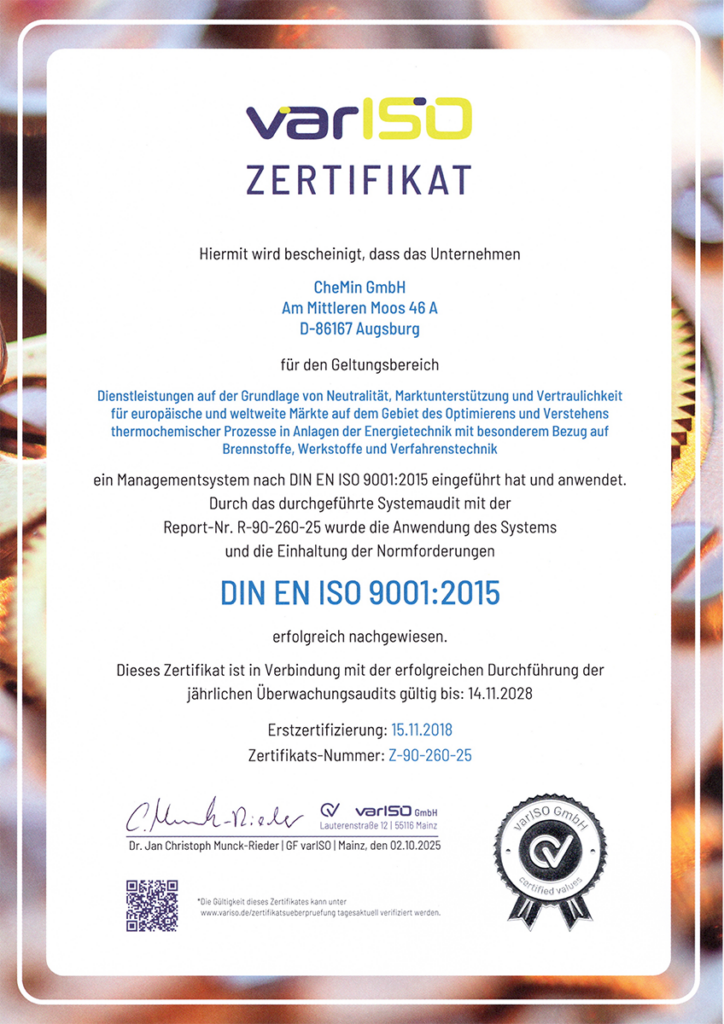Die Che­Min GmbH kann ver­schie­de­ne Zer­ti­fi­zie­run­gen vor­wei­sen, die für Dienst­leis­tun­gen auf dem Gebiet des Opti­mie­rens und Ver­ste­hens ther­mo­che­mi­scher Pro­zes­se in Anla­gen der Ener­gie­tech­nik gelten: